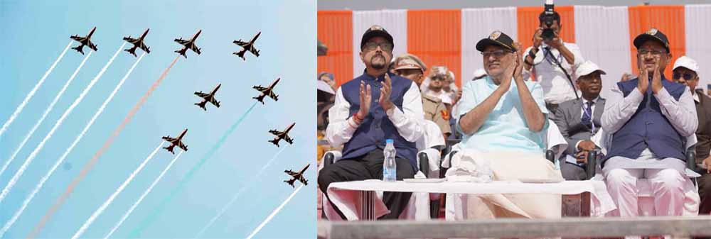 वायु सेना के जाबांज फाइटर पायलटों ने आसमान में दिल की आकृति बनाकर 25वें राज्योत्सव की शुभकामनाएं दीं। उन्होंने तिरंगे के तीन रंगों से डीएनए की आकृति बनाकर तिरंगे के प्रति अपना सम्मान प्रस्तुत किया। उन्होंने 360° में फाइटर जेट उड़ाते हुए उल्टा जेट भी उड़ाया। तेजस और युवाओं को समर्पित अंग्रेजी अक्षर 'वाई' की आकृति बनाने के साथ ही कई करतब दिखाए। टीम का प्रदर्शन केवल मनोरंजन नहीं, बल्कि युवाओं में देशप्रेम, साहस और भारतीय सशस्त्र बलों में सेवा की प्रेरणा जगाने का संदेश भी देता है।